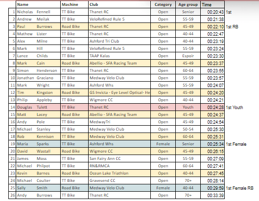Sunday saw the velo promoting their first open time trial of the season. Initially planned to be a 25 mile event, the race was shortened to 10 as a consequence of road works in Lenham. Thanet RCs Nic Fennell took the overall win, with Maria Sparks being the first women back. Paul Burrows was the fastest road bike, whilst Sally Smith, riding her third event in 36 hours was the fastest female road bike.